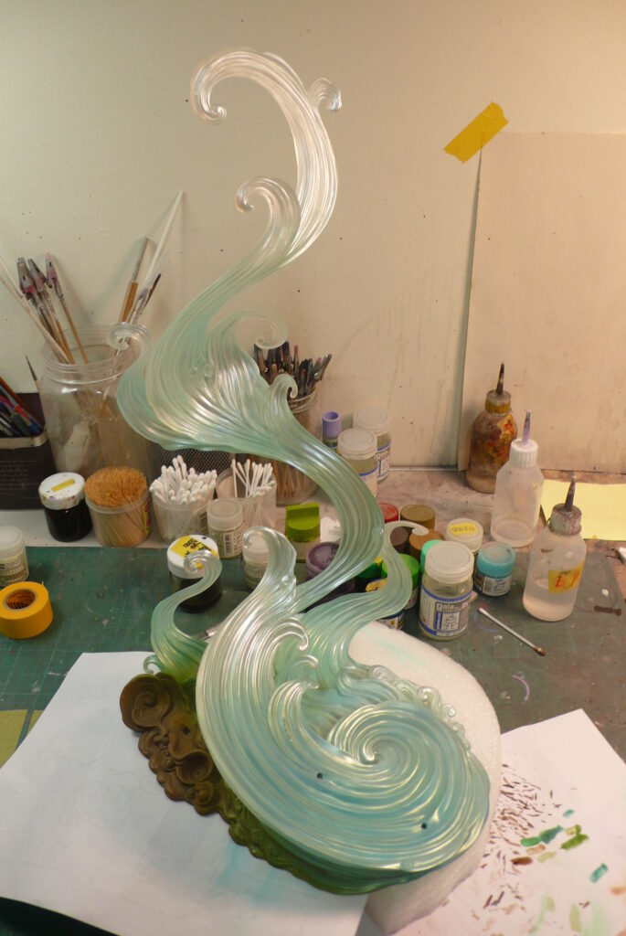 這透明特效件原本就是整體最亮眼的設計之一,但在塗裝時的難度也不容小覷。從底部噴入青綠色,製造出如同神獸衝出雲霧的視覺效果。光的穿透與表面流動感,是照片看不出的實體魅力。