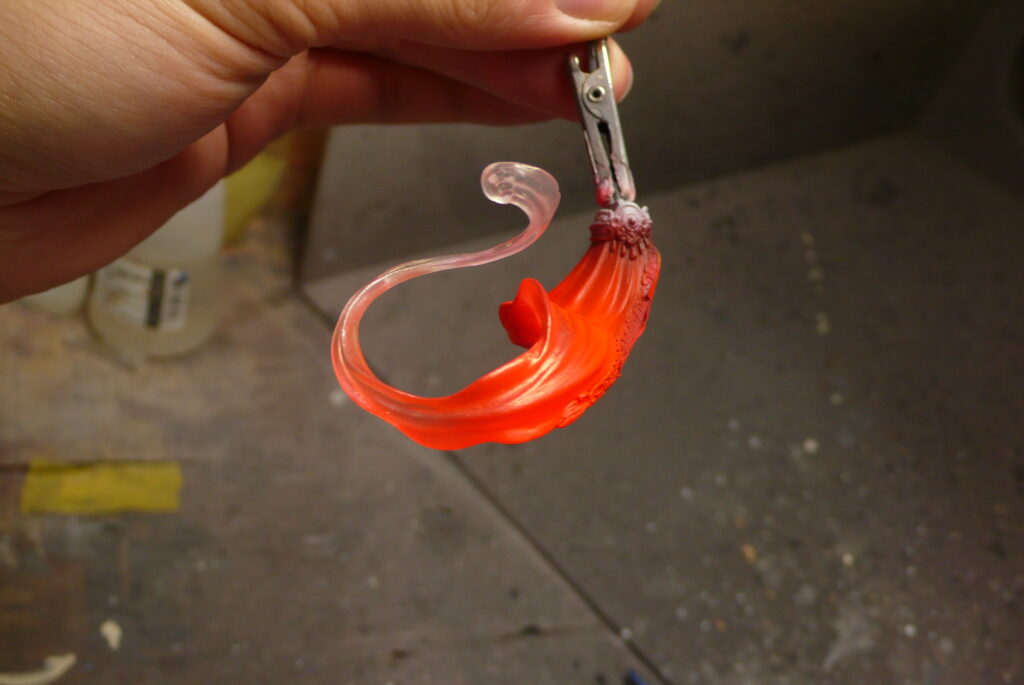 紅色火焰效果件,是採用由透明紅向紫紅的噴塗漸層,利用光澤感加強火焰升騰的感覺。手持這種小配件上色時要小心,夾具固定、距離控制都會影響最終的純淨度。