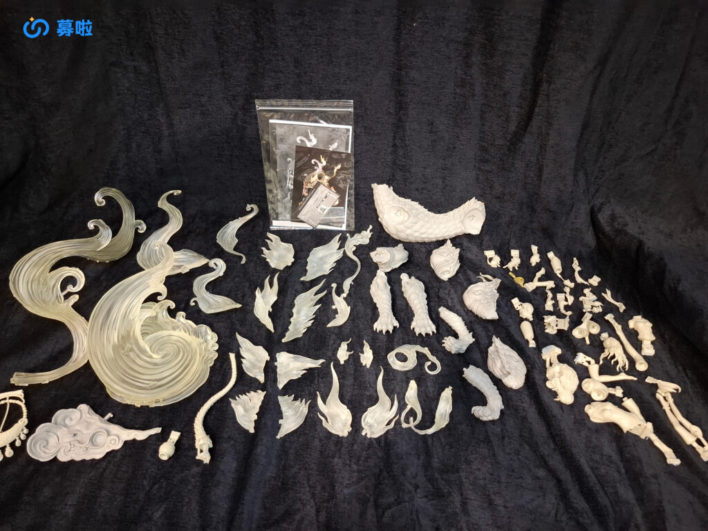 這款《西宮白虎》光是零件就超過百件,包含:火焰特效件、獸腿、人物頭雕與軀幹,還有超大的透明特效件。擺滿一整桌,整個視覺衝擊感十足,彷彿一場尚未開演的舞台劇即將展開。