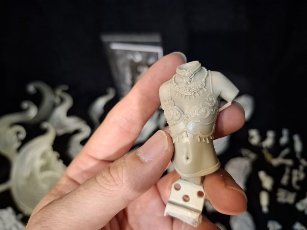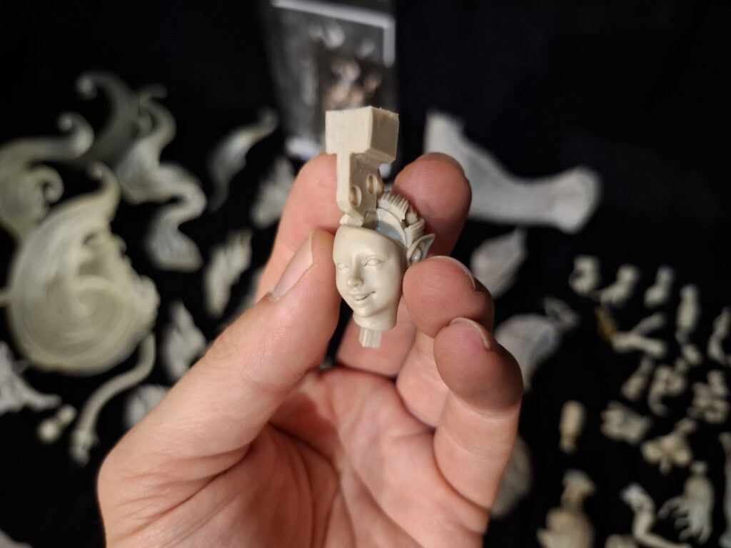 拿起這顆頭雕時,不得不說她讓整組作品更有靈魂。耳飾、眉眼、頭飾的層次感處理得極為清晰,甚至連角度都已經預留好組裝定位。