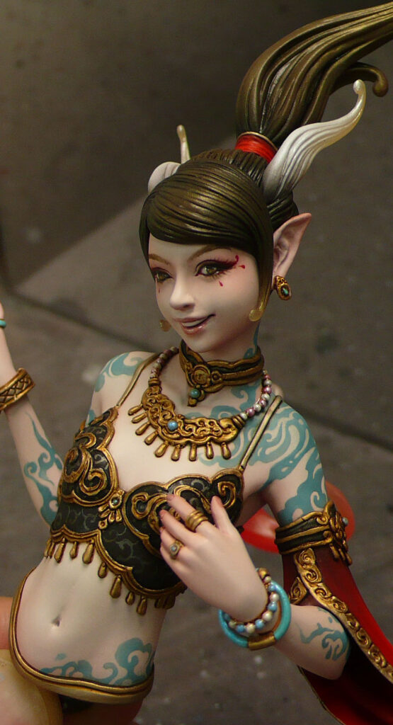 這位角色的笑容與眼神完全對應她坐騎上「飛天女神」般的身段,搭配耳飾與小細節點綴,真的是細膩到極致。這樣的表情處理,比起「畫臉」,更像是在賦予角色性格。