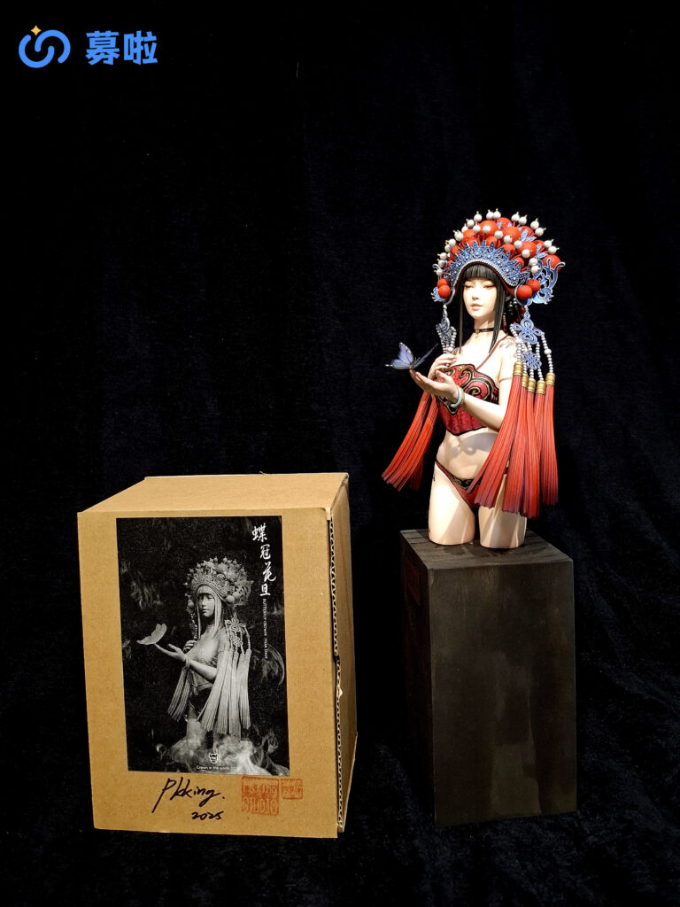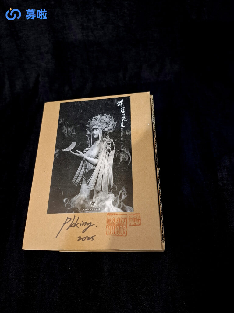 第一眼看到包裝盒,是一種手工藝品的質感:牛皮紙盒搭配黑白封面視覺,有種像書法與攝影展海報的味道。封面圖正是成品姿態,煙霧繚繞裡的她帶點神祕,旁邊印有「蝶冠花旦」字樣與 PKKing 的簽名與紅印,儼然是藝術作品本尊登場。