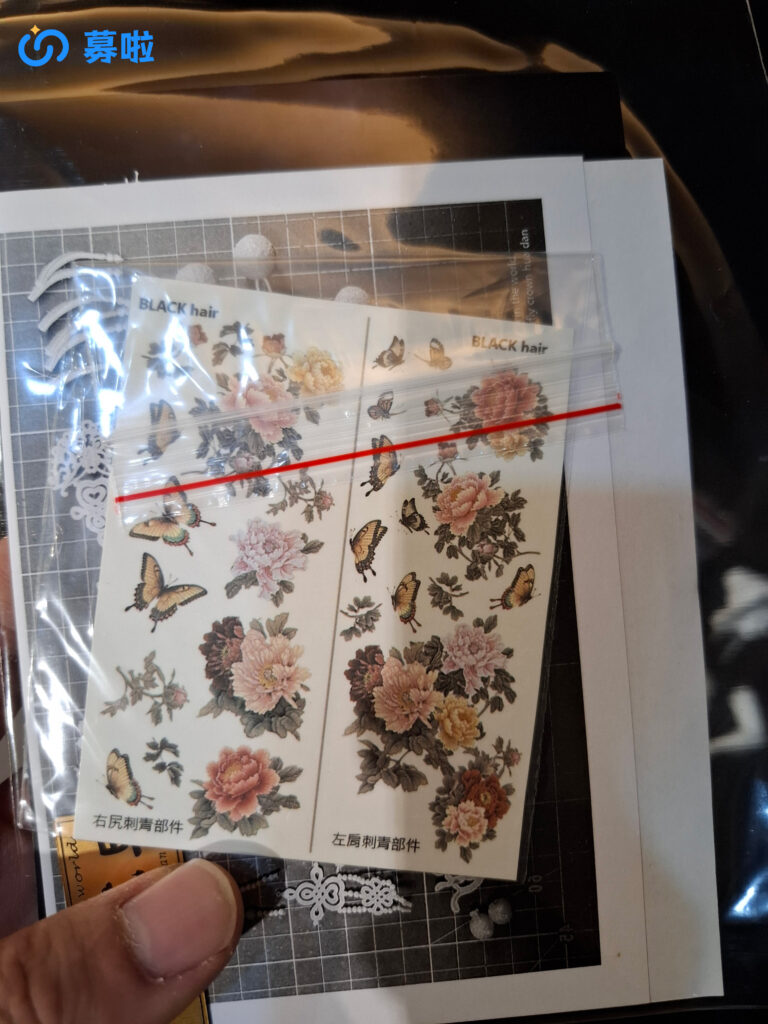 套件附上非常精緻的水貼紙,包含蝴蝶與牡丹的花紋,可以依照說明貼在模型上的刺青位置。這類貼紙讓我想到傳統戲曲中刺繡花紋的延伸,文化意象透過這種方式非常加分。