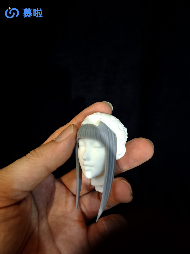 臉部與瀏海是分開列印件,輪廓乾淨,眼神閉著的神情很耐人尋味。瀏海列印非常銳利,代表雕刻時就已精密規劃結構,對髮絲上色與打光非常有發揮空間。