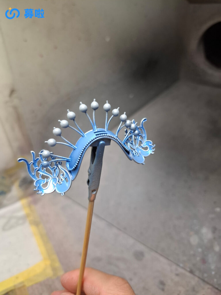這張拍攝的是「頭冠主體」的塗裝上色過程。由原始灰階列印轉為帶有金屬質感的青藍,從中能看出細緻的筆觸與遮蓋力控制。珍珠圓珠部分帶有光澤漸變處理,讓整體更有層次與氣勢。