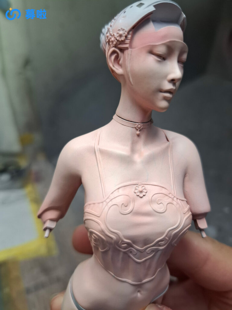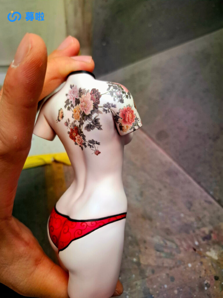 這一張特別拍了背部肌理與身體曲線,線條真的非常優美,從肩膀到背脊到臀部都非常流暢。我在思考這尊可以嘗試透明肌膚技法(例如噴光透層色),或是直接實作實體膚色與紋飾來重現傳統美感。