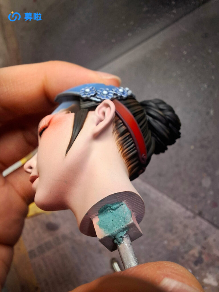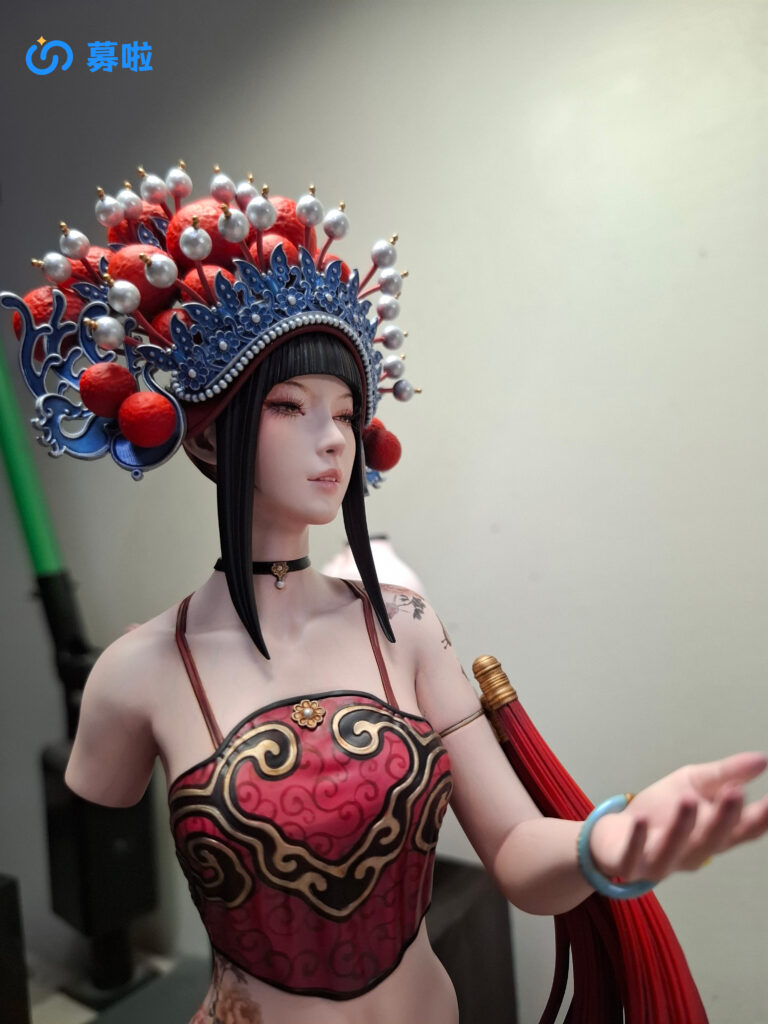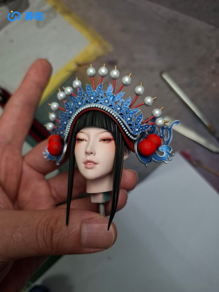 完成組裝的頭冠與髮飾實裝上頭部,紅色繡球與藍色頭飾形成鮮明對比,再加上髮絲的流動與臉部細緻度,整體氛圍已非常接近成品展示的狀態,充滿東方戲曲之美。