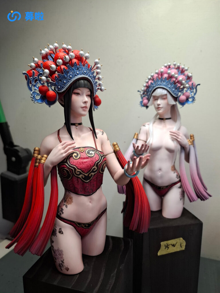 最後這張是不同版本的「蝶冠花旦」展示圖,一位黑髮紅衣、一位白髮粉衣,各自有不同風格與情緒,但都圍繞著那份融合傳統與幻想的東方美感。每一尊都是藝術品般的存在。