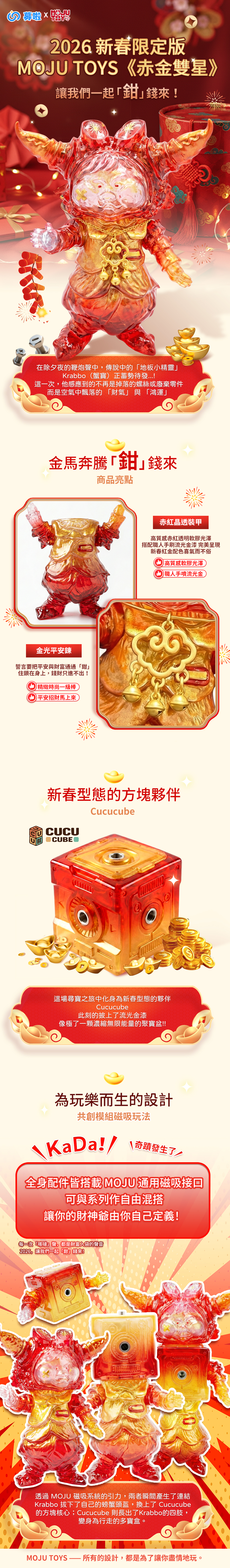 MOJU Toys 由資深原型師蟹佬創立,致力打造「能玩的藝術品」。歷時一年開發的核心磁吸系統,實現跨材質自由換件。2026 新春限定《鉗(錢)都要!》Krabbo,玩轉模組化「紙娃娃系統」。配件喀噠一聲即變換,祝您新春創意與財富「全都要」