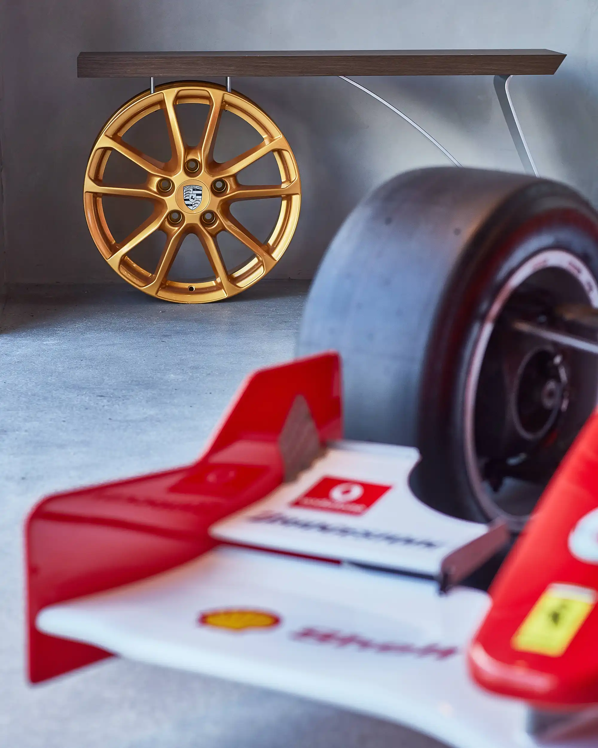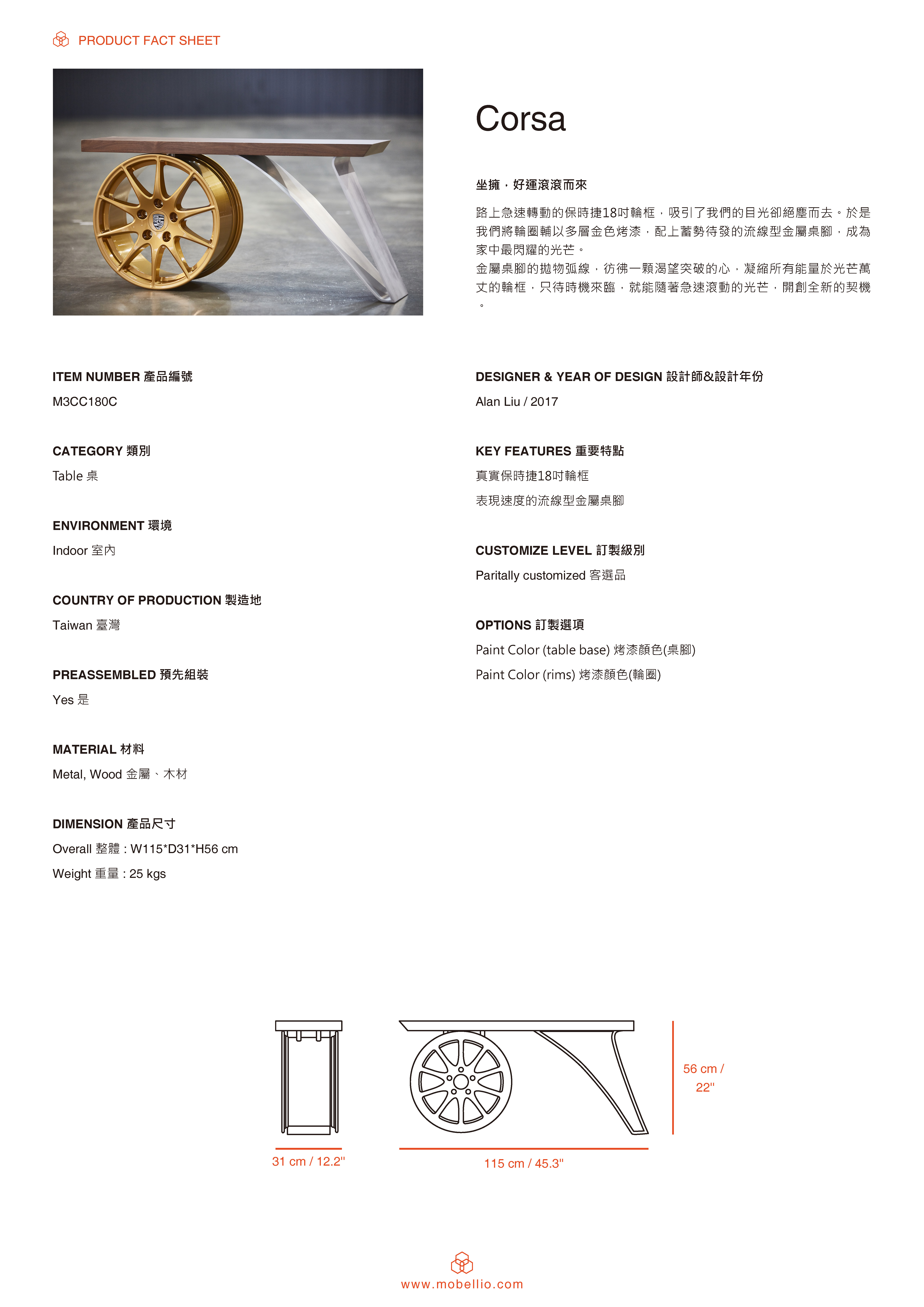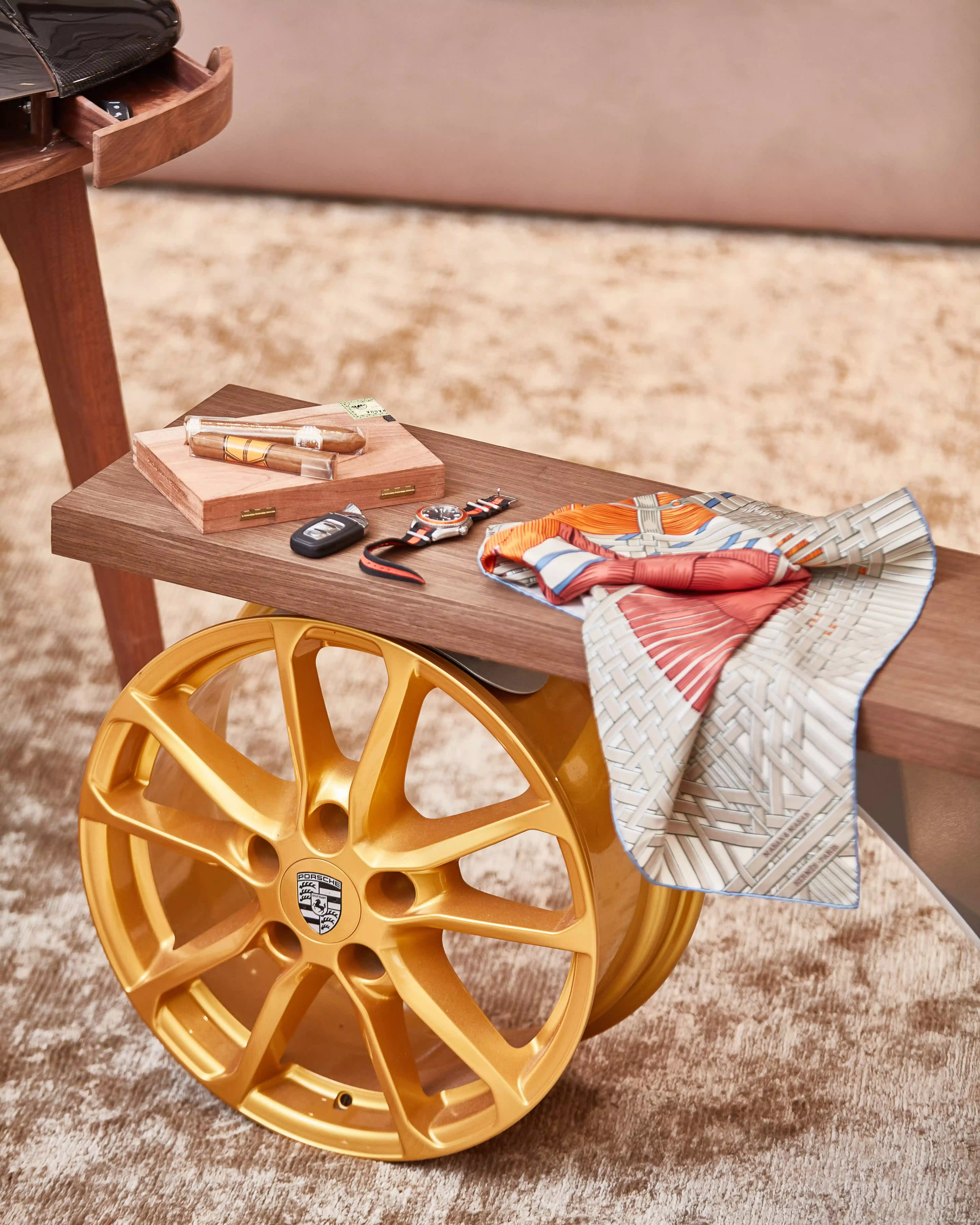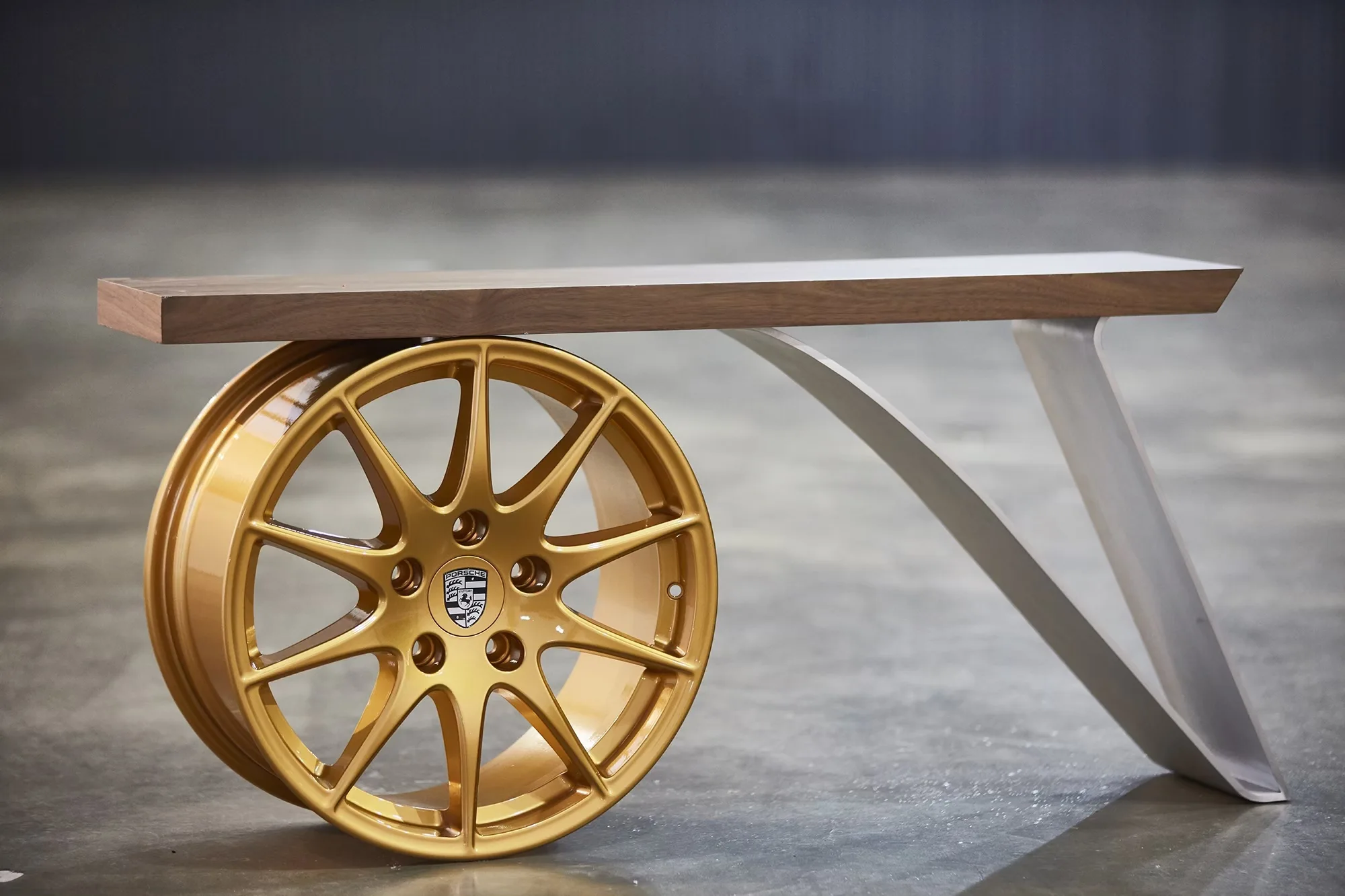 設計師透過流線型的金屬桌腳線條表現出速度、流線與動力感,簡約大方的設計也能依照各人不同的需求作擺設上的變化。路上急速轉動的輪框成為了桌腳的一部分,胡桃木桌板帶來的沉穩感與流線的線條結合展現出獨特的動靜之美,成為家中最閃耀的光芒。